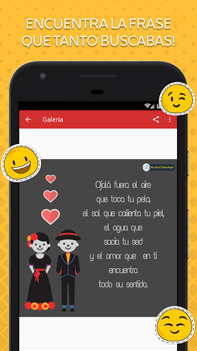 No existe obsequio más valioso en el mundo, que los piropos de amor que te ofrece nuestra genial app. Llena de color, sentimiento, pasión y alegría el entorno de la persona que tanto te atrae, así lograrás conquistar al 100% su corazón. Disfruta del romanticismo y de cada detalle que colocamos a tu alcance con tan solo un clic.