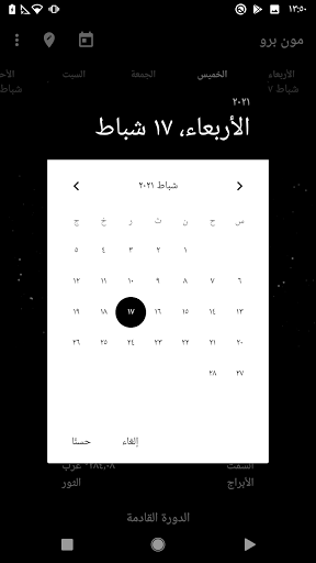 - عرض دورة القمر لأي تاريخ في المستقبل عن طريق التمرير على شريط التاريخ أو عن طريق النقر على زر التقويم!