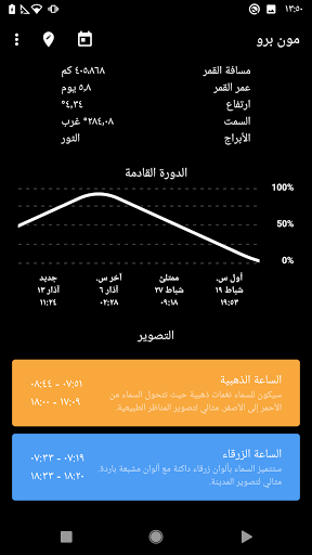 My Moon Phase Pro هو أفضل تطبيق لتتبع التقويم القمري. يتميز بتصميم داكن أنيق يجعل من السهل عرض المعلومات مثل دورة القمر الحالية وأوقات شروق القمر وغروب القمر بالإضافة إلى الإضافات مثل وقت اكتمال القمر التالي. إذا كنت مهتمًا بالتصوير الفوتوغرافي للقمر ، فيمكنك أيضًا معرفة موعد الساعات الذهبية والساعات الزرقاء حتى تتمكن من التقاط أجمل الصور.