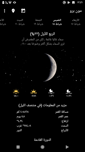 - يتوفر المزيد من المعلومات المحددة مثل مسافة القمر عن الأرض ، وعمر القمر وكذلك الارتفاع الحالي. هذا متاح لأي تاريخ في التقويم القمري.