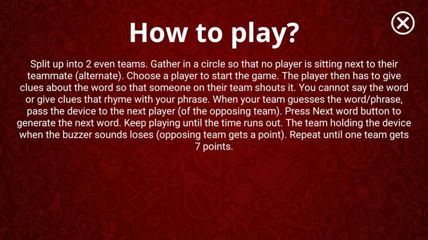 تقسيم إلى 2 حتى فرق. جمع في دائرة بحيث لا يوجد لاعب يجلس بجوار زميله (مناوب). اختيار لاعب لبدء اللعبة. لاعب ثم أن تعطي أدلة حول كلمة بحيث شخص على فريقهم يصرخ عليه. لا يمكنك أن تقول كلمة أو إعطاء القرائن التي قافية مع عبارتك. عندما التخمينات فريقك كلمة / عبارة تمرير الجهاز إلى اللاعب التالي (الفريق المنافس). اضغط على زر "الكلمة التالية" لتوليد الكلمة التالية. الاستمرار في اللعب حتى نفاد الوقت. فريق عقد الجهاز عندما تقرع الجرس يفقد (معارضة فريق يحصل على نقطة واحدة). كرر حتى يحصل فريق واحد 7 نقاط.