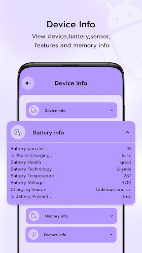 - عرض البطارية، الجهاز، الاستشعار، الميزات والمواد ومعلومات الذاكرة