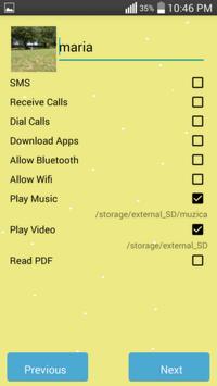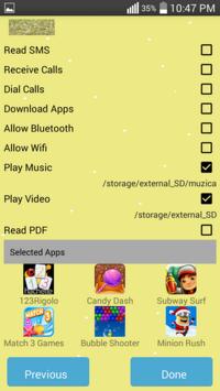 You can lock SMS, Contacts, gmail, Facebook, Gallery, Market, Settings, Calls and any app you choose, and prevent accidentally downloading apps, make phone calls, or texting .
