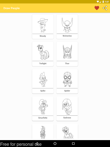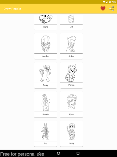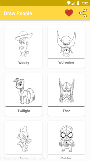 التطبيق يحتوي على دروس: - تعلم رسم وجه أشخاص. رسم الأشخاص خطوة بخطوة. رسم شخصيات كرتونية. كيفية رسم جسم أشخاص. يحتوي على عديد من الصور التي تعلمك الرسم خطوة بخطوة.