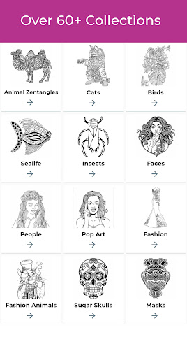 - الزهور: تصاميم الأزهار والطبيعة الجميلة تنتظر في الداخل. جماجم السكر: جماجم وأقنعة فريدة من نوعها. الفن الغامض مع التنينات والحيوانات الموحدة أيضًا. من الألوان في صفحتك لملء العديد من المسارات في وقت واحد.