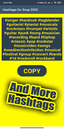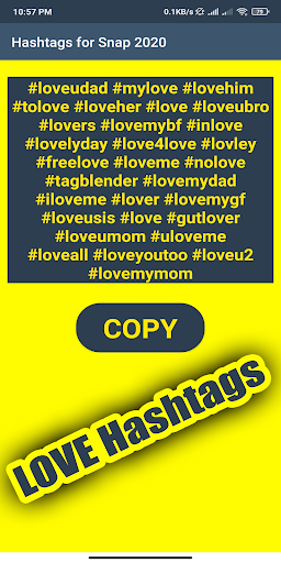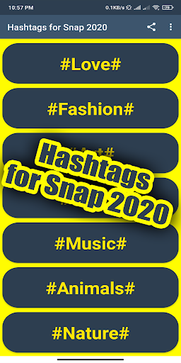 سيساعدك تطبيق "Hashtags for Snap 2021" على زيادة "الإعجابات" و "التعليقات" للصور ومشاركات الفيديو وزيادة تفاعلها. ما عليك سوى نسخ ولصق علامات التجزئة في التطبيق إلى منشور Snapchat الخاص بك. هناك الكثير من الفئات ، يمكنك اختيار الفئة التي تناسبك .. ثم اختر فئة الهاشتاج إذا كنت ترغب في الترويج لحسابك والحصول على المزيد من الإعجابات والمتابعين ، فأهم علامات التصنيف لـ Snapchat emojis و bitmojis ضرورية لـ أنت. كما نعلم ، فإن الإصدار المحدث الجديد من الإصدار المميز من Snapchat Messenger 2021 هو نوع جديد من الكاميرات التي تتصل بأصدقائك وبالعالم. يستخدمه أكثر من 180 مليون شخص يوميًا للتحدث واللعب مع مقاطع الفيديو الموسيقية ذاتية الحركة والتعلم والتقاط بعض الصور أيضًا. تم تصميم تطبيقنا للإصدارات القديمة والأحدث