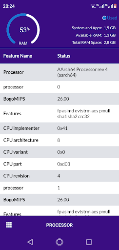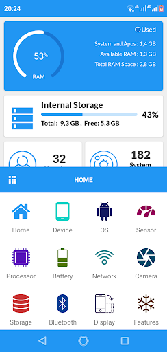 Device Info is a simple and user-friendly Android app that gives you complete and detailed information about your mobile device with the best user interface. This application is useful not only for normal users but also for developers who create cores or android applications. The Device Info app has many features that give you all the information about your android device's software and hardware, such as processor, RAM, operating system, sensors, storage, battery, SIM card, Bluetooth, installed apps, system applications, screen, camera, thermal system, codecs and inputs.