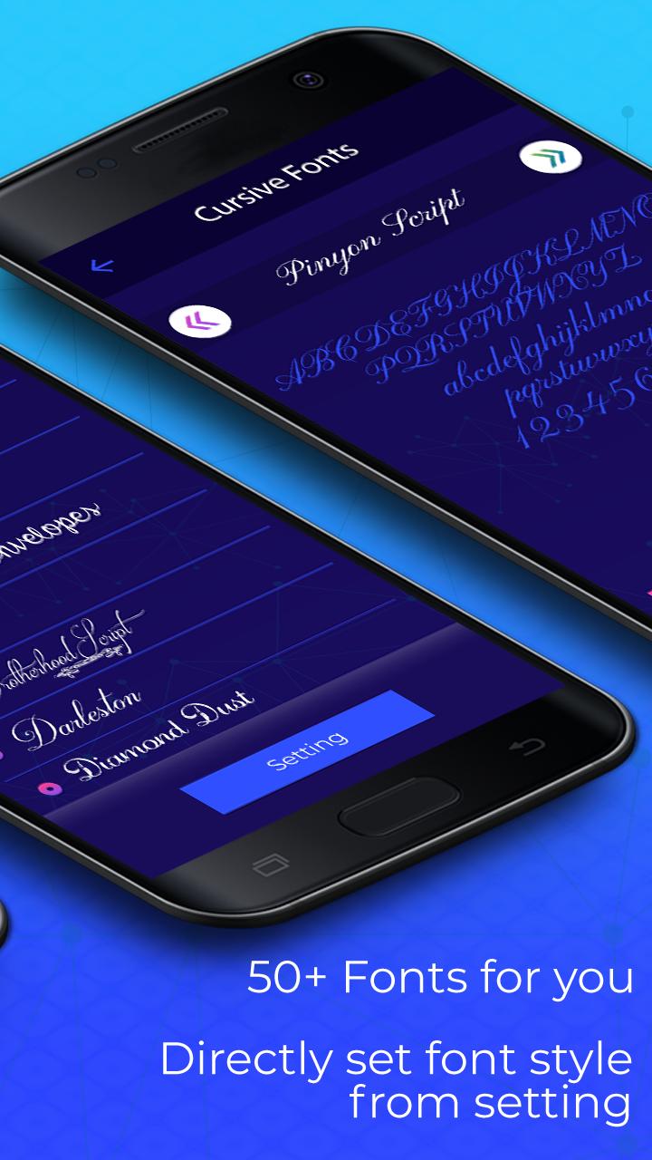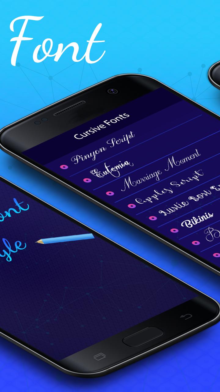 Cursive Fonts Style is a unique font manager for android devices. Cursive Font Style provide number of stylish fonts, funny, cool, cute, Cursive etc.. Cursive Font Style easy to use, preview the fonts details,and download and use it, then all system fonts will be changed.Cursive Font Style is easy to change system font. use,enjoy & share via social networking.