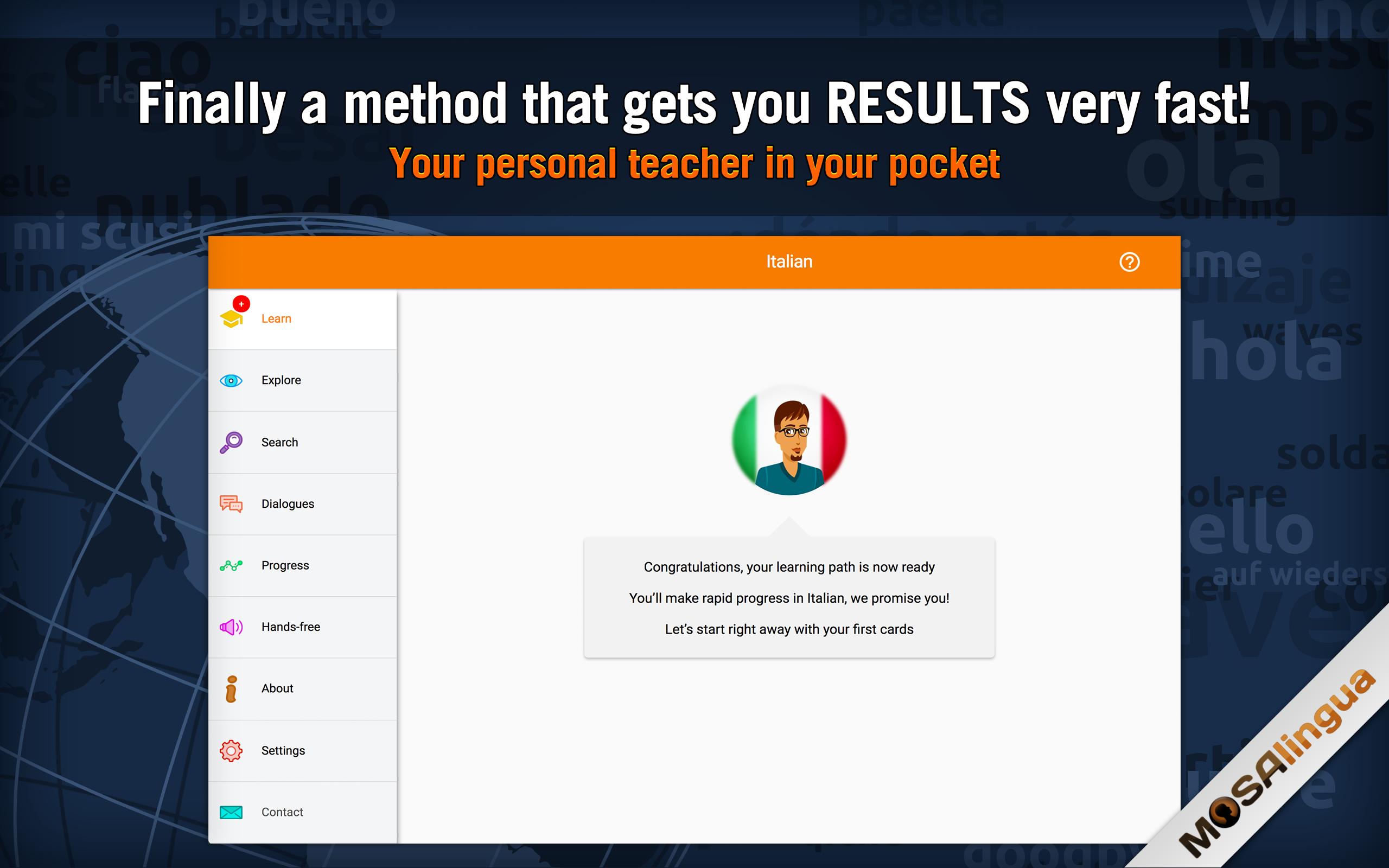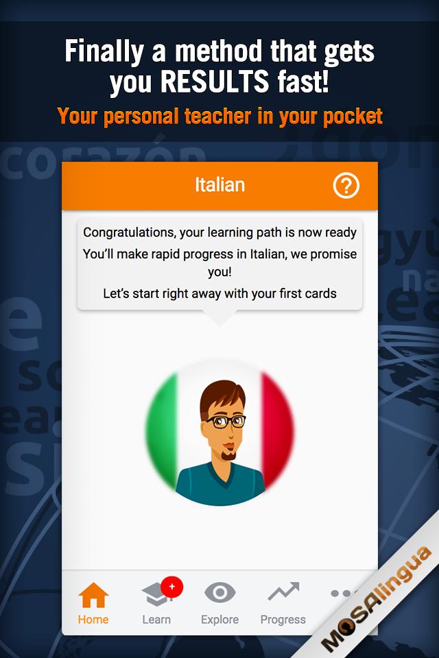Whether you are starting Italian from scratch or you already know the basics, MosaLingua is adapted to suit your language needs. It's like having your own private tutor in your pocket!