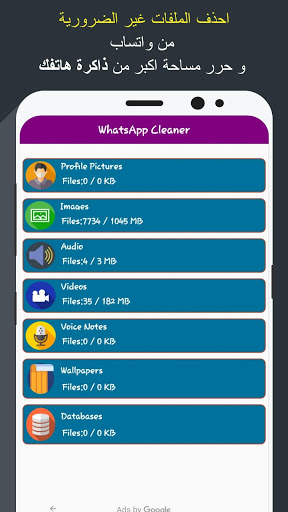 تطبيق صغير يمكنك من حذف ملفات الواتس اب والدردشات والصور والفيديوهات التي لاتحتاجها وتحرير مساحة اكبر على جهازك عن طريق تحديد الملفات وحذفها بسهولة او تحديدها جميعا وحذفها