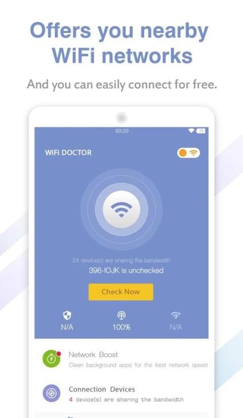 واي فاي الطبيب هو قوية وبسيطة ومجانية أداة الشبكة التي يمكن أن تجعل سرعة الشبكة بشكل أسرع وآمن وأكثر استقرارا. وهو مصمم لتشغيل اكتشاف الشبكة وحماية ينشط بالإنترنت، ومسح جميع الأجهزة المتصلة واي فاي الخاص بك النقاط الساخنة، وتسريع الاتصال بالشبكة عن طريق إغلاق التطبيقات قيد التشغيل في الخلفية.