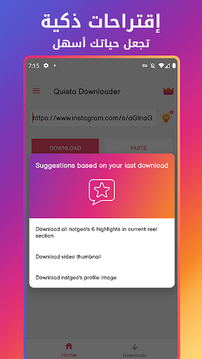 الاقتراحات الذكية: عندما تقوم بتحميل صورة او فيديو، سيقوم التطبيق بوضع اقتراحات لك بناء على التحميل الحالي، مثل تحميل صورة الغلاف الشخصي للمستخدم الحالي أو اذا قمت بتحميل قصة واحدة وكان لديه العديد من القصص، سيقترح التطبيق تحميلهم جميعاً لك بضغطة زر واحدة. والمزبد من الاقتراحات المفيدة التي يمكنك استكشافها!