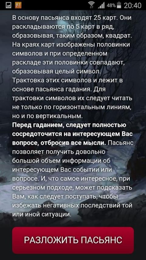 هذه الطريقة غير عادي من الرجم بالغيب، ودعا الهندية القديمة سوليتير سوليتير أو الرجم بالغيب. هذا البخت وضعت حتى لدينا كبيرة الأجداد. تعكس عرافة سوليتير حكمة الشعب، رموز له قريب وعزيز على كل رجل، وتذهب من مواقف الحياة. يتكون سوليتير من 25 بطاقة. بطاقات وضعت من خمس بطاقات في كل صف، كما تبين، خمسة صفوف من خمس بطاقات. على طول حواف البطاقات رتبت نصفين من شخصيات مختلفة. في بعض الأحيان هذه نصفين من نفسه، وشكلت تفسير حرف من الأحرف مطابقة راء مآس الرجم بالغيب. قبل اللعب سوليتير، تحتاج إلى التركيز بشكل كامل على المشكلة الفائدة. عندما نهجا خطيرا، التخمين سوف اقول لكم كيفية التصرف من أجل تجنب عواقب وخيمة في أي حالة معينة.