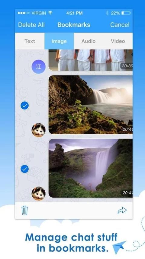 You can add chat infos,files,images,videos and anything you like to bookmark, so that you can check and send them any time you want.