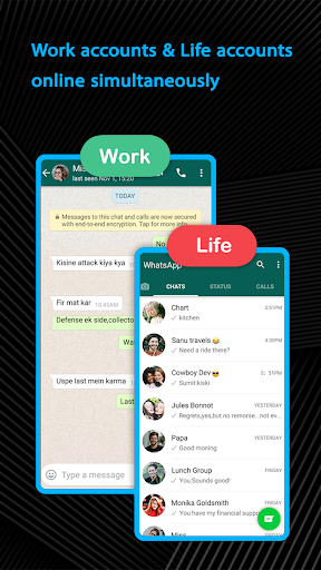 Multiple accounts are online at the same time, for example multiple WhatsApp, one for office business and one for life chat.