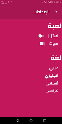 ويوجد اعدادات للتحكم في الصوت والاهتزاز و اللغه