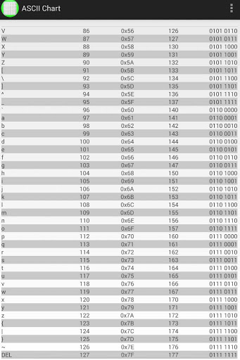 مخطط ASCII بسيط يظهر Char، DEC، HEX، OCTAL، ثنائي.لا يتطلب أذونات.