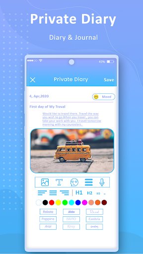 - Add photos from your gallery or add a mood emoji to each entry and express your emotions easily.