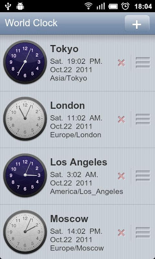 The world time Businessmen,Time,Timezone,clock The World Time can tell you the accurate time about any timezone of the world.Maybe you are in London,but you want to know what time it is now in Tokyo or los angeles If you have world time, you can know time, even date about the area you wanted. It is very useful for the foreign businessmen or people in the foreign countries.features 1.Choose and add cities you wanted, if you want to know the time, date of any city.2.Have the function of searching for cities.3.If you want to add new city, you can click fork to cancel the other old.4.The clock is beautiful, display white in the day, deep blue in the night.