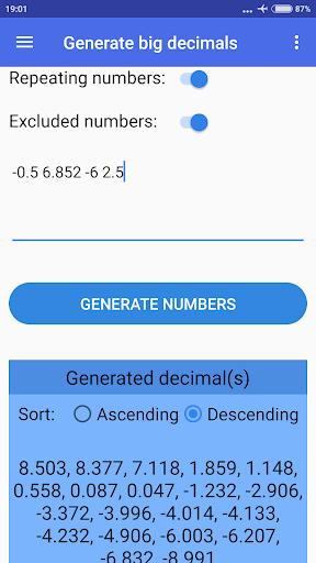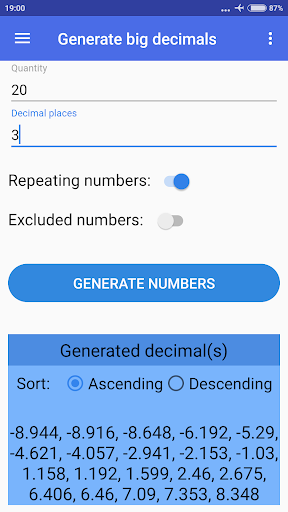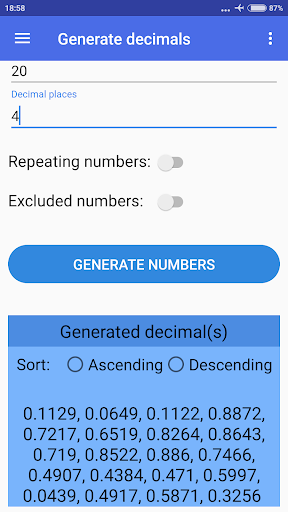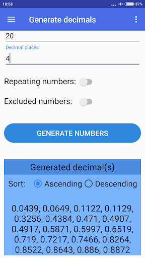 يمكنك أيضًا تحديد ما إذا كنت ترغب في استبعاد أرقام محددة أم لا ، إذا كنت تريد تكرار أرقام عشوائية أو لا وفرز النتائج إما بترتيب تصاعدي أو تنازلي (الترتيب الافتراضي عشوائي).