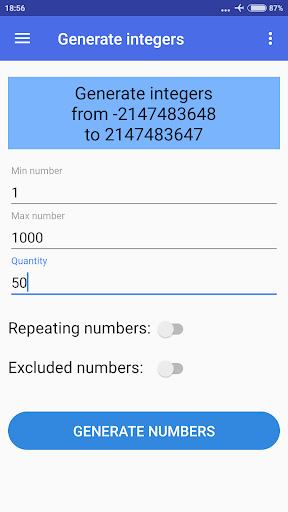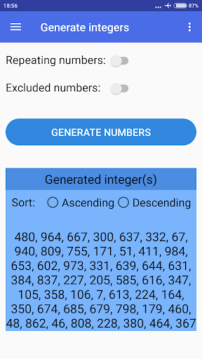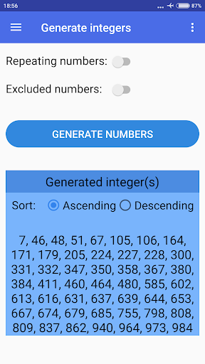 أدخل أعلى عدد صحيح.> يمكنك أيضًا أن تقرر ما إذا كنت تريد استبعاد أرقام محددة أم لا ، إذا كنت تريد تكرار أرقام عشوائية أو لا ، وفرز النتائج إما بالترتيب الصاعد أو الهبوط (الترتيب الافتراضي بشكل عشوائي).