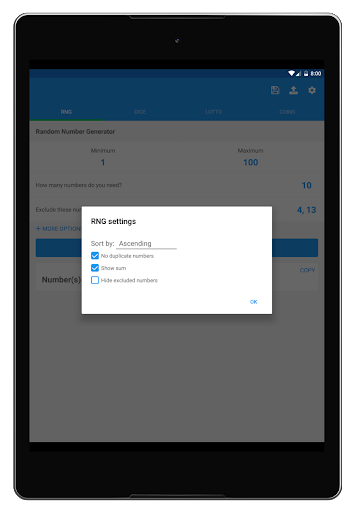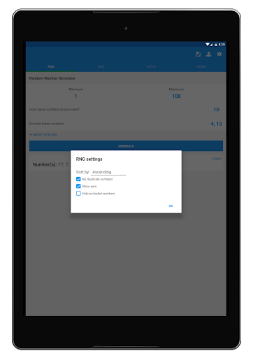 مع مولد الأرقام العشوائي الافتراضي، يمكنك تخصيص مقدار الأرقام التي تريدها إلى جانب النطاق الذي تريد أن يكون من. يمكنك أيضا استبعاد أرقام محددة، فرز النتائج عن طريق ترتيب تصاعدي أو تنازلي، إظهار مجموع الأرقام التي تم إنشاؤها، ونسخ تقرير الأرقام الناتجة إلى الحافظة الخاصة بك لسهولة المشاركة والنقل.