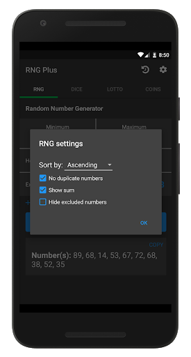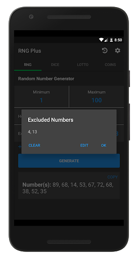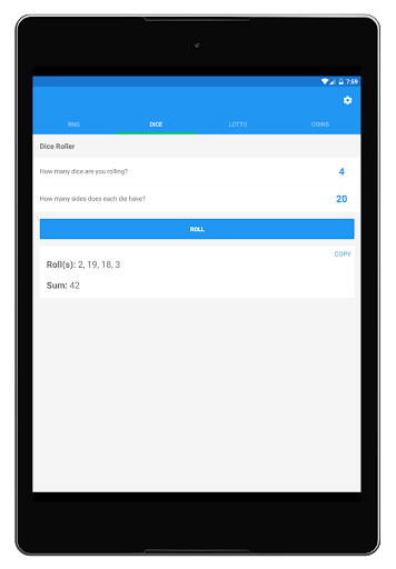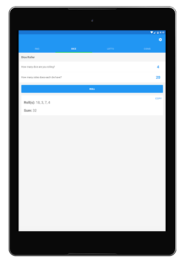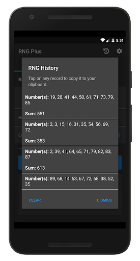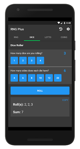 لا أعرف عنك، ولكن النرد المتداول في الألعاب مزعجة في بعض الأحيان. انهم بصوت عال وأنهم ينتهي بهم الأمر في كل مكان. هذا هو السبب في أن Glash Number Generator Plus أيضا يحتوي أيضا على وضع المتداول في النرد حيث يمكنك طرح العديد من النرد الذي تريده بأي كمية من الجوانب التي تريدها. يمنحك مولد الأرقام العشوائية بالإضافة أيضا مجموع النرد المدلفن ويسمح لك بنسخ النتائج إلى الحافظة الخاصة بك. لحفظ الوقت، يوفر التطبيق "خيارات سريعة" بالنسبة للمبالغ الشائعة من جوانب النرد ومبالغ النرد حتى تتمكن من لفة النرد بسرعة للألعاب الشعبية مثل الأبراج المحصنة والتنين.