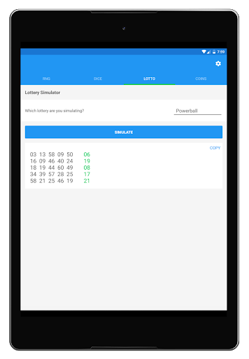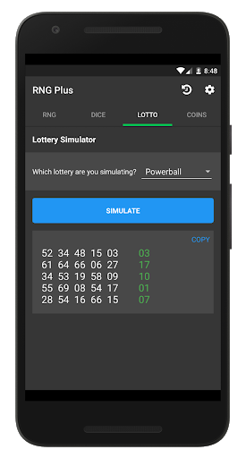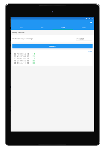 شعور محظوظ؟ ثم دعونا محاكاة اليانصيب أو اثنين! توليد 5 تذاكر اليانصيب عشوائي / النتائج بنقرة زر واحدة. يمكنك الاختيار من بين محاكاة PowerBall أو Mega Millions. أوه نعم، يمكنك أيضا نسخ النتائج إلى الحافظة الخاصة بك بنقرة بسيطة مثل ميزة "مولد أرقام عشوائي".