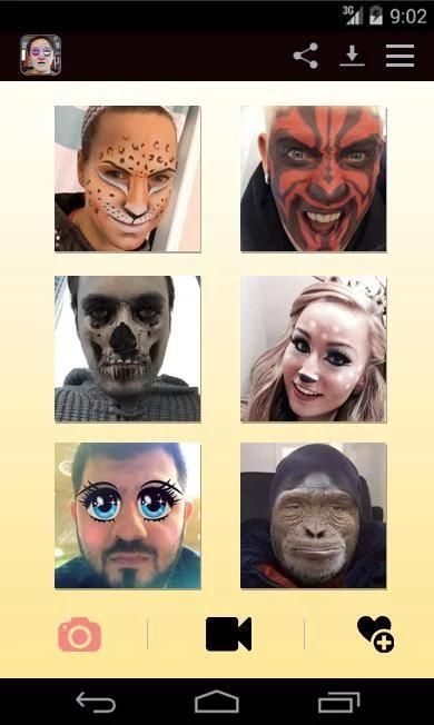 اختيار الصورة المفضلة من مجموعة من 1000 صور. في محاولة على قناع أو الحيوان قناع في أسلوب الفن وفرضه على الصور ومشاركتها مع الأصدقاء.