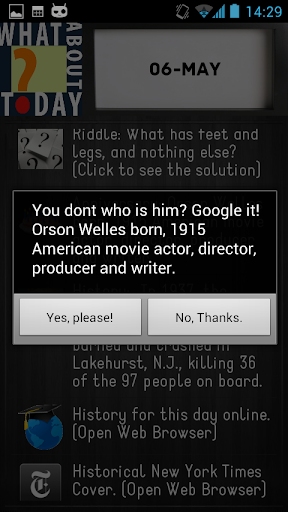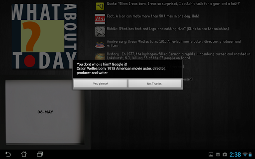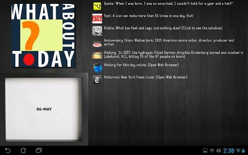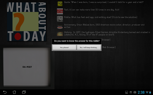 "Whether its at a party, a picnic, or a get together, trivia is always quite fun. Be it on the bottom of a bottle cap, on the wrapping of sweets or on actual trivia cards, these little nuggets of information more often than not, trigger a satisfying little ‘oh…cool!’ moment every time you read one. Well, now you can enjoy this moment everyday conveniently with the app What About Today? on your Android device.