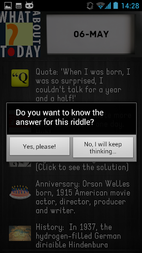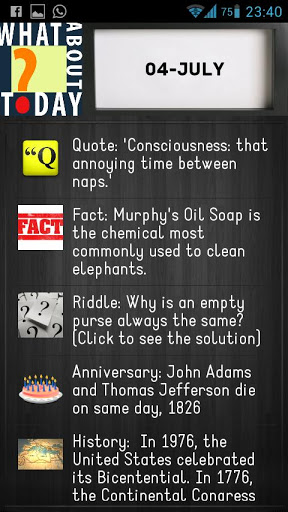 If you are curious and wanna grow your mind but you don't have time, don't worry, with What About Today? you will learn a lot of things everyday: a famous quote, a curious fact, an anniversary of an important person, a little bit of history or just get fun with the funniest riddles!