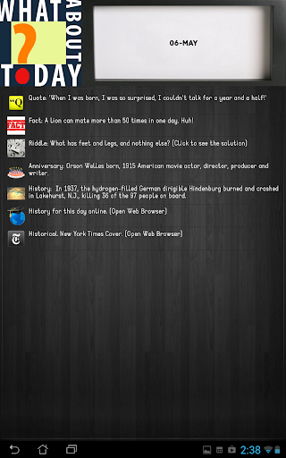 All the content of the application will be stored in your phone and you can use it without internet, but in addition, What About Today? also have 2 online functionalities: "Online History" and "Historical New York Times cover".