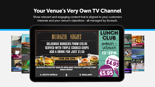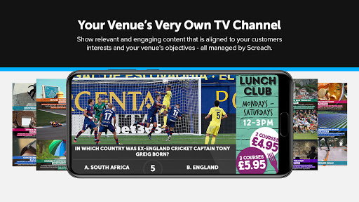 ببساطة قم بتثبيت تطبيق TV SCREACH إلى جهاز Android الخاص بك (مثل جهاز تلفزيون أو جهاز لوحي أو عرض POS) لتحويل شاشاتك إلى رقمية تفاعلية لافتات وعرض الرياضة الحية.