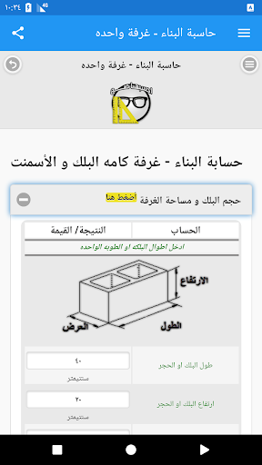 فقط قم بأدخال المقاسات و انظر للنتائج , تكلفة الأسمنت و الدهانات و البلك الاحجار و البلاط و الرخام و الحديد و الخرسانة ....
