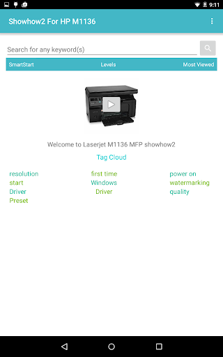 Showhow2 for HP LaserJet M1136 is a completely new kind of how to app. It is focused on the HP LaserJet M1136 printer organised intuitively to take you to your solution quickly. How to install ink cartridge, how to clean printer interior, how to scan a photo. Its all there - in step by step video. You can key in a simple search like "driver" or go through the many organised sections like SmartStart ­ your must use features, Levels and Most viewed. You can also get started with the given popular Tags.