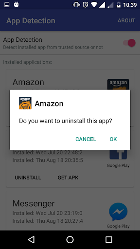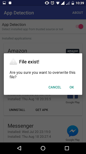 App Detection is an application that detect new installed application. Then automatically check whether it is from trusted store or not.