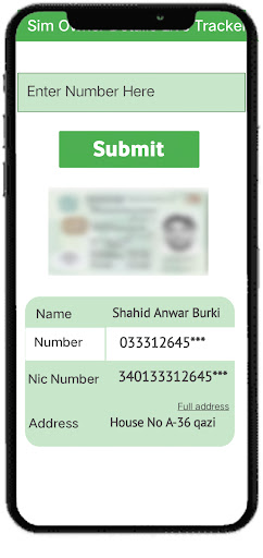 في هذا التطبيق ، تفاصيل SIM Tracker Live Tracker أضفنا قاعدة بيانات جديدة.PAK SIM بيانات CF.على تفاصيل رقم SIM لتجربة المستخدم العاملة في Live Tracker باكستان 2022 أمر مفهوم للغاية. تجربة المستخدم العاملة لمالك SIM تفاصيل Live Tracker 2022 أمر مفهوم للغاية.يمنحك هذا التطبيق تفاصيل مالك SIM لتفاصيل Live Tracker ، كل رقم SIM ، رقم cnic ، الموقع المباشر لرقم المالك.الرقم الذي يزعجك أو أحد أفراد عائلتك.إذا نسيت رقمك الثاني ، فإن هذا التطبيق يساعدك في العثور على رقمك.الآن هذه ليست مشكلة كبيرة.إذا كان لديك تفاصيل مالك SIM Live Tracker 2022 ، فما عليك سوى الدخول.يمكنك العثور على اسم أو عنوان أو معلومات رقم cnic أو موقع مباشر