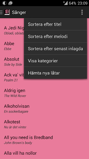 Du kan hämta nya sånger från datatekniksektionens sångarkiv genom att klicka på menyn i övre högra hörnet och sedan välja "Hämta nya sånger" när du är i sånglistan.