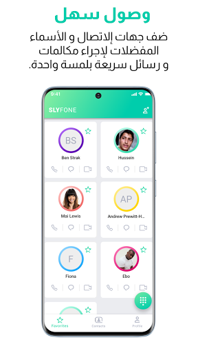 المراسلة أو الاتصال بلمسة واحدة لا حاجة للتمرير عبر قوائم طويلة من جهات الاتصال. بنقرة واحدة فقط وأنت متصل! أضف أرقامًا إلى مفضلات Slyfone الخاصة بك وقم بإجراء مكالمات ورسائل ودردشة فيديو بنقرة واحدة فقط.