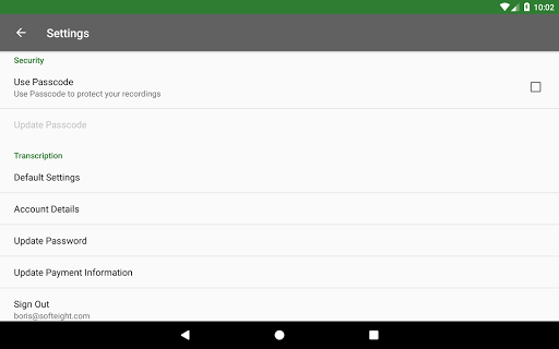 مع أحدث إصدار، يمكنك الآن تسجيل التسجيلات في مستندات نصية في أكثر من 120 لغة وفي تنسيق مستند من اختيارك. قم بإنشاء حساب واحصل على رصيد بقيمة 20 دولارا لتجربة خدمة النسخ مجانا مجانا. تعرف على المزيد حول خدمة النسخ على http://www.dictadadroid.com/transcription/about.html