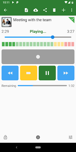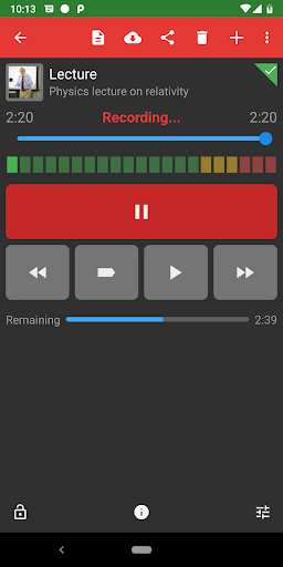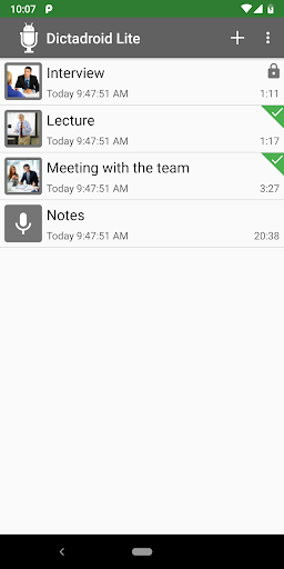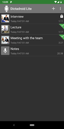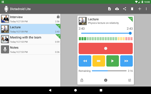 يقوم Dictadroid بتحويل هاتف Android أو جهازك اللوحي إلى جهاز إملائي محترف وعالي الجودة ومسجل صوتي. استخدمها لتسجيل الإملاءات الصوتية أو الملاحظات أو الاجتماعات أو الموسيقى أو أي صوت آخر ومشاركتها عبر البريد الإلكتروني أو FTP أو Box أو Google Drive أو Dropbox.
