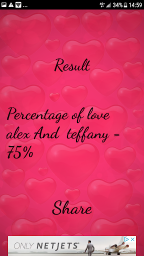 If you are looking for authentic love calculator app than you are at the right place. We developed a very authentic love calculator app which calculates love percentage by name. This love test calculator app is very authentic and it gives real love percentage of the two lovers.