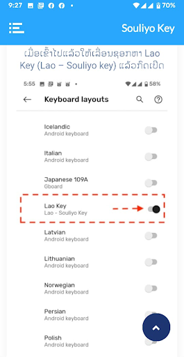 Souliyo Key هو تطبيق سيسمح لك بالكتابة لغة لاو على لوحة مفاتيح مادية، لوحة مفاتيح خارجية، لوحة مفاتيح بلوتوث، لوحة مفاتيح الحالة، وأكثر من ذلك