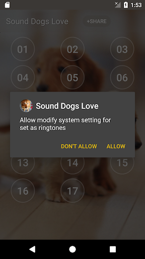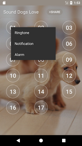 17 Sound Dogs Love, set as ringtone, notification, alarm and easy to use. Application Features - 17 tracks - set as ringtone - set as notification - set as alarm - play repeat