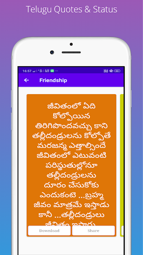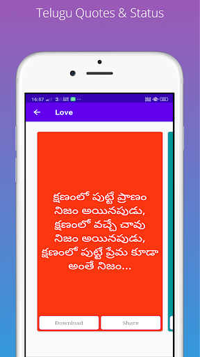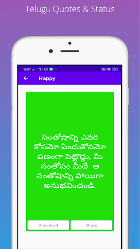 తెలుగు స్టేటస్ షేర్ (Telugu Quotes & Status) هو تطبيق واحد للحصول على أفضل عروض الأسعار والخلفيات لتنزيل وحالة WhatsApp الخاصة بك.جميع الاقتباسات في اللغة التيلجو فقط.