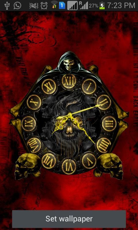 Skull Gothic Clock Live Wallpaper set to the screen of a clock design that does not lose the proportion of the image when placing it on the screen, marking the hours, minutes and seconds. Contains 12 backgrounds, placed in funds designed for each.