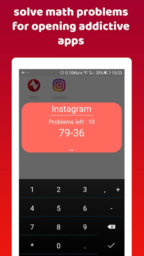 Today, we think that addictions make us happier, but, in fact, it's the opposite.We cut our time spend on our work,our relationships and our health just to scroll a little bit more on face book .Phone addiction is one of the biggest causes for depression,anxiety and suicide. And we are here to stop it. Solving math problems before opening addictive apps is a clever way to cut your time spend on those apps. It's like having a candy in front of you and not opening it. Here are the key features of the app: