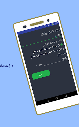 - يمكنك تغيير وزنك ووحدات القياس من الإعدادات ، سيحفظ GPS 2 Calories Pedometer وزنك في السجل مع كل تمرين.