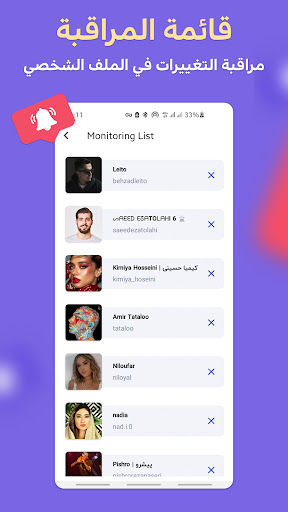 ⚠️ من خلال هذا التطبيق ، يمكنك مراقبة أي ملف تعريف تريده والاطلاع على التغييرات في الملف الشخصي !! لمراقبة أي ملف تعريف تقوم بتنزيله ، انقر فوق زر الجرس الموجود في الملف الشخصي.