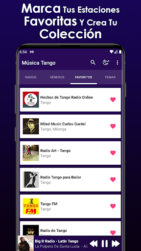 في هذا التطبيق ستجد أفضل محطات الراديو موسيقى التانغو عبر الإنترنت، متخصصة في نقل الأفضل مع مجموعة واسعة من أجهزة الراديو FM. هنا يمكنك الاستماع إلى الراديو المباشر، وضبط أفضل المحطات مع محتوى واسع ومجموعة متنوعة من الفنانين الذين يمثلون هذا النوع ك Carlos Gardel، وهو أقصى رمز للجنس. ضمن Tangos الشهيرة لهذا الأسفل هي أغاني تانجو ليلتي الحزينة، من خلال رأس، وهبوطا، وهيلكته، من بين أمور أخرى.
